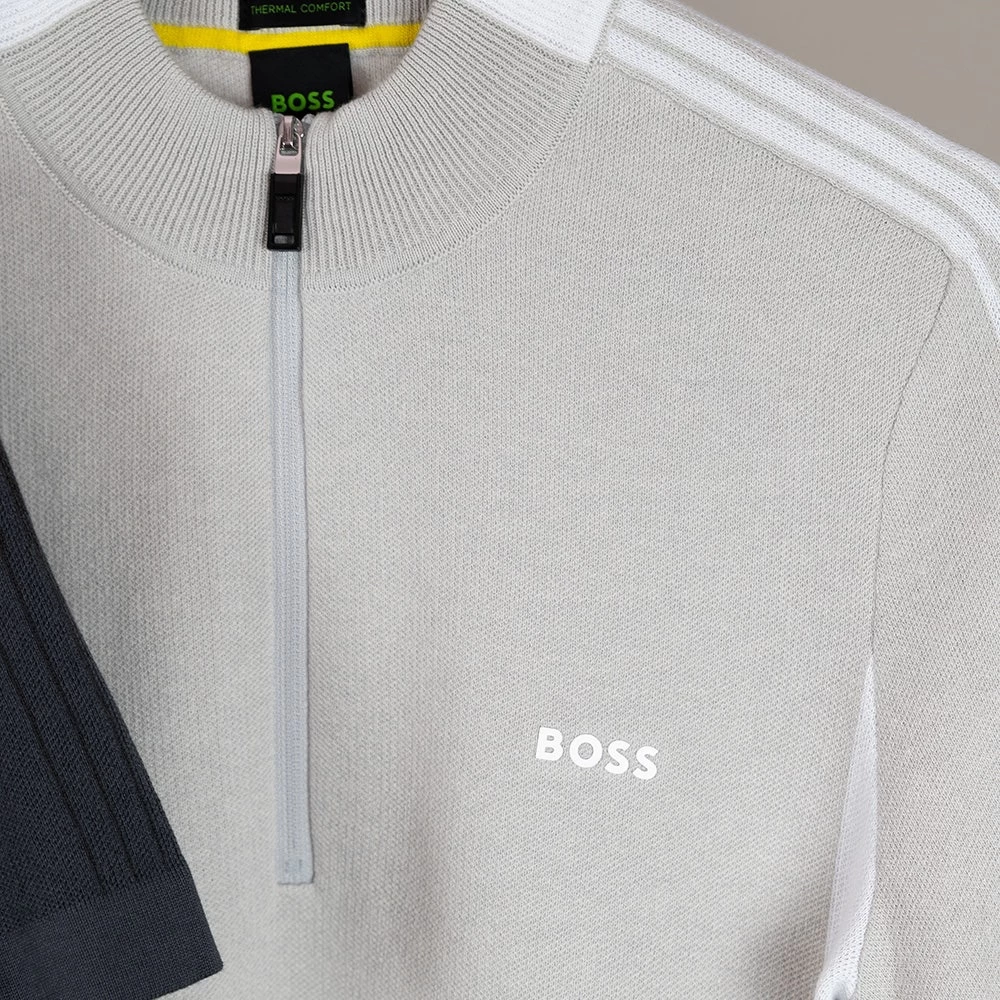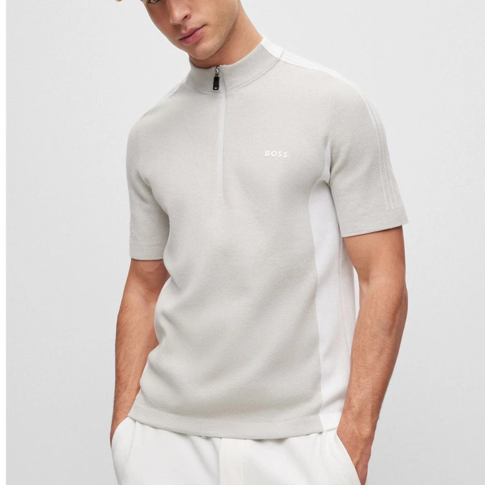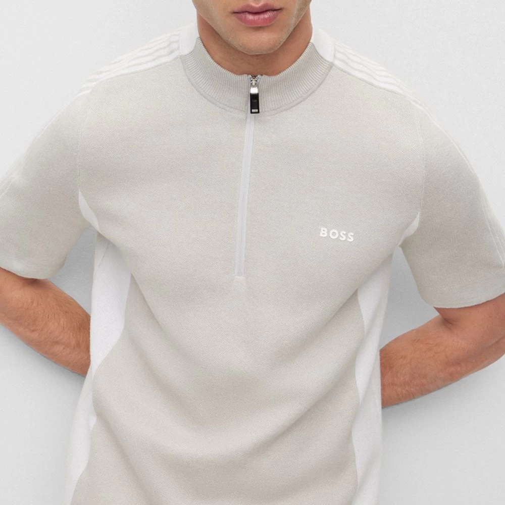 This quarter zip BOSS Golf jumper is new from the Fall ’23 collection and features all the key attributes that you would expect from a top quality BOSS knitwear style – this time upon a short sleeve silhouette for a unique look. The seasonal colour combination is enhanced with tonal detailing which adds some visual interest at the sides – while the signature BOSS logo is located at the left chest. The naturally high stretch level ensures freedom of movement, while high quality cotton fabric is perfect for wearing both on and off the golf course. Another winning knitwear style from BOSS Golf which is a must have for 2023 – perfect for wearing on its own or as a stylish layering piece this season.
