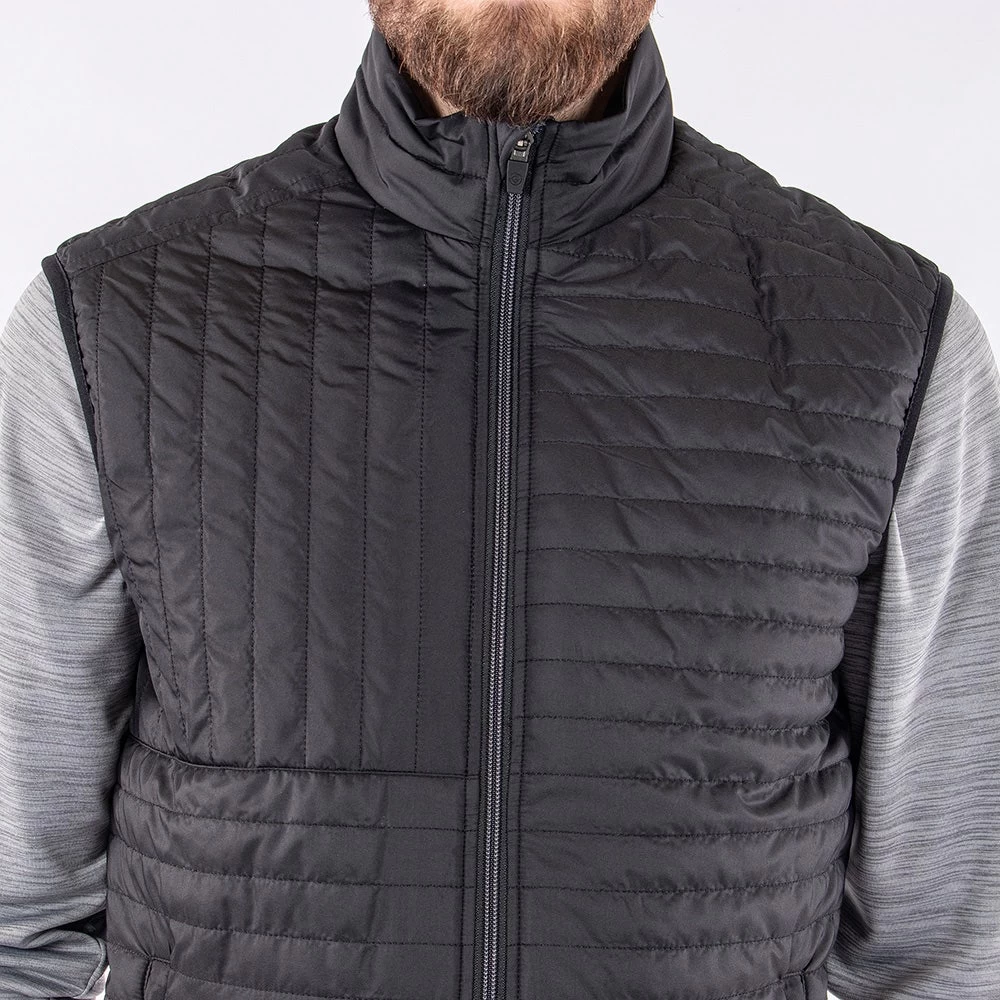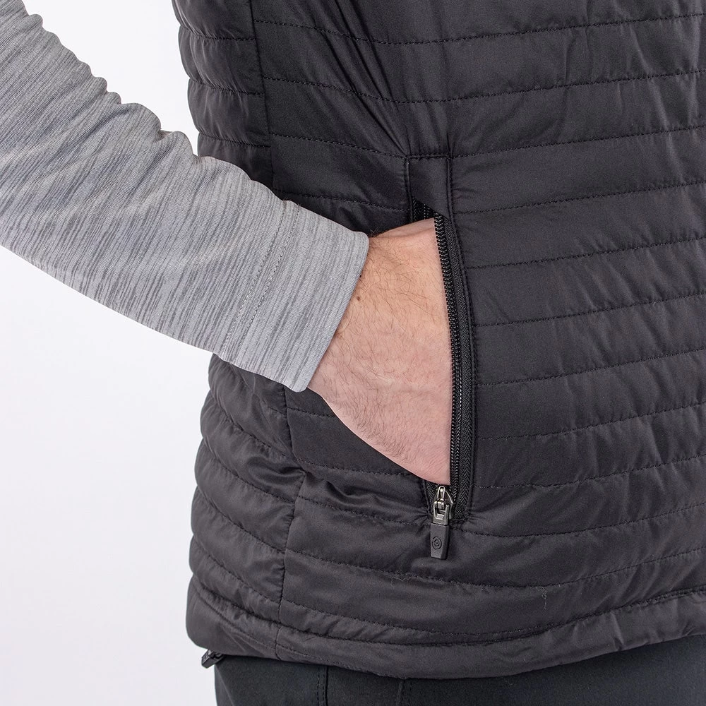Interface-1 golf outerwear styles make use of a proprietary soft shell fabrication which has been especially developed for complete wind proof protection and reliable water resistance. This particular quilted gilet style also boasts Primaloft insulation for added warmth, while still providing a relatively high level of water repellent protection. The comfort factor is increased as the internal backer is designed to slide & glide over any other garments worn beneath. The timeless styling allows for effortless layering of outfits, while the elasticated arm holes and drawstring at the waist ensure a perfect fit.