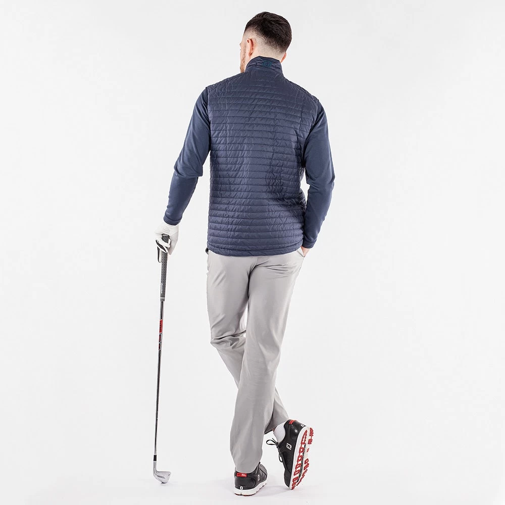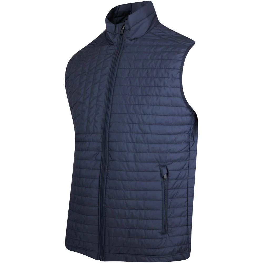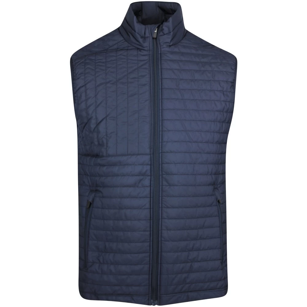 Interface-1 golf outerwear styles make use of a proprietary soft shell fabrication which has been especially developed for complete wind proof protection and reliable water resistance. This particular quilted gilet style also boasts Primaloft insulation for added warmth, while still providing a relatively high level of water repellent protection. The comfort factor is increased as the internal backer is designed to slide & glide over any other garments worn beneath. The timeless styling allows for effortless layering of outfits, while the elasticated arm holes and drawstring at the waist ensure a perfect fit.