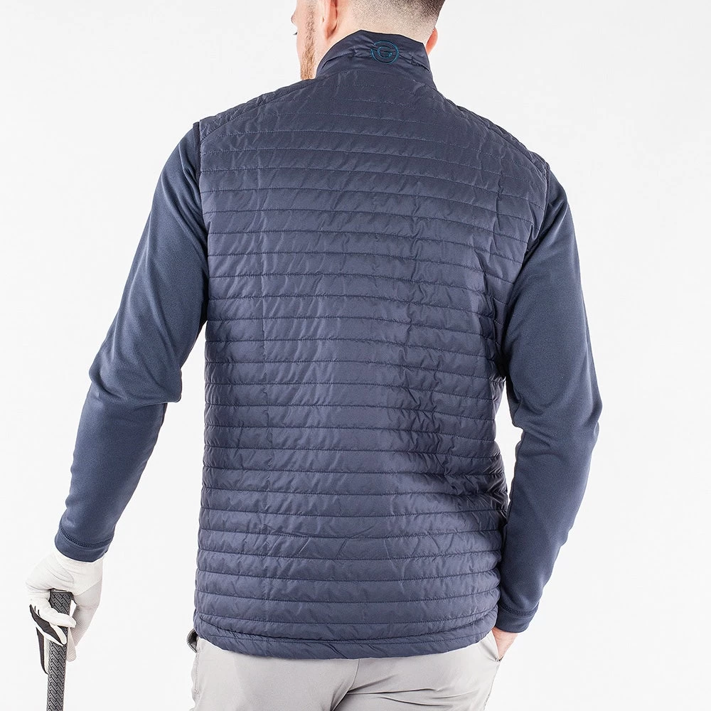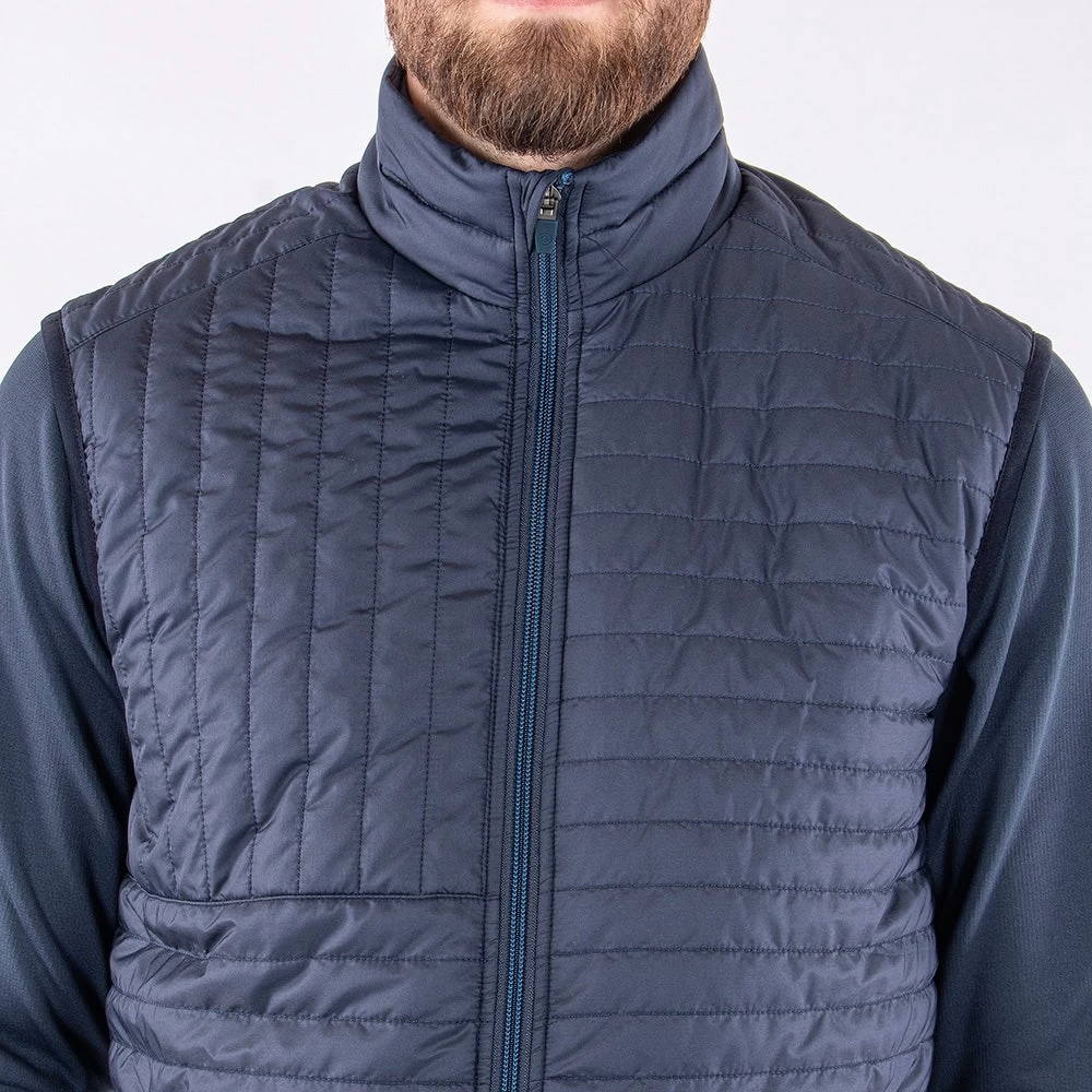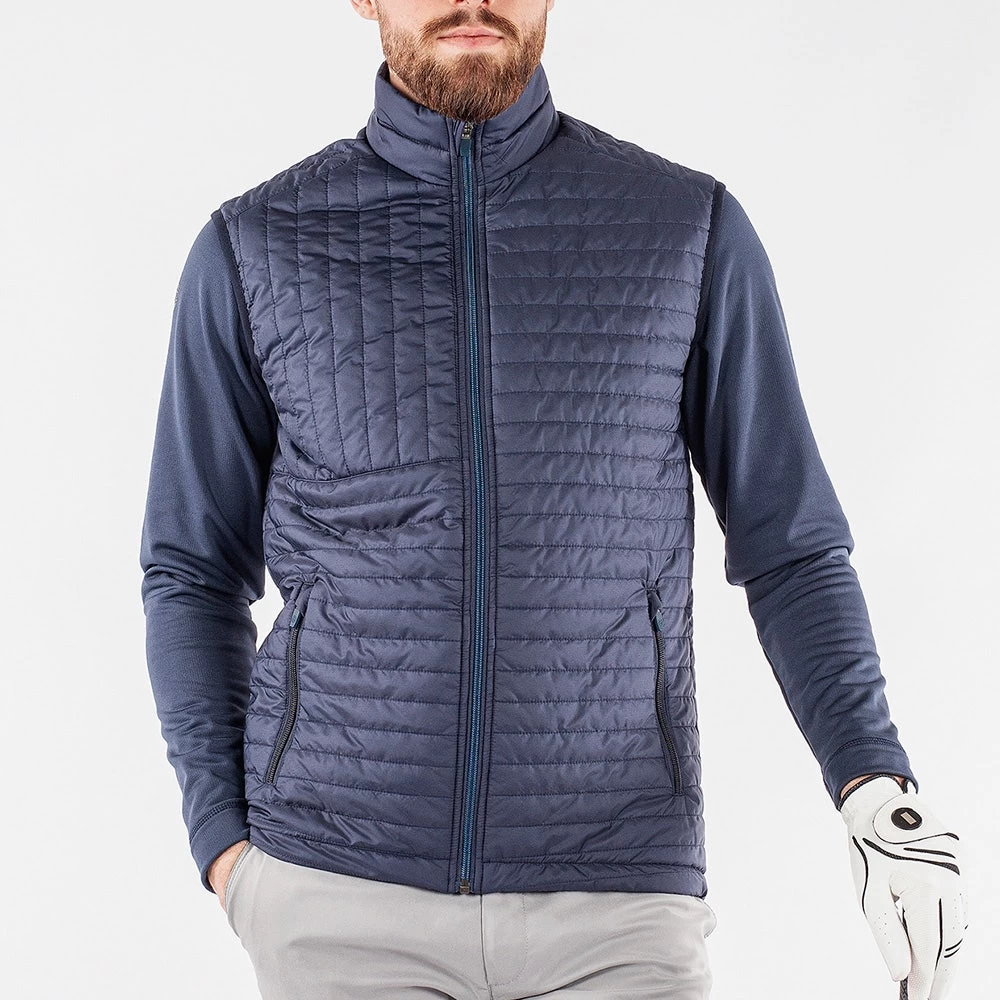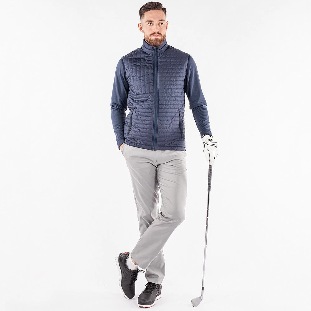 Interface-1 golf outerwear styles make use of a proprietary soft shell fabrication which has been especially developed for complete wind proof protection and reliable water resistance. This particular quilted gilet style also boasts Primaloft insulation for added warmth, while still providing a relatively high level of water repellent protection. The comfort factor is increased as the internal backer is designed to slide & glide over any other garments worn beneath. The timeless styling allows for effortless layering of outfits, while the elasticated arm holes and drawstring at the waist ensure a perfect fit.