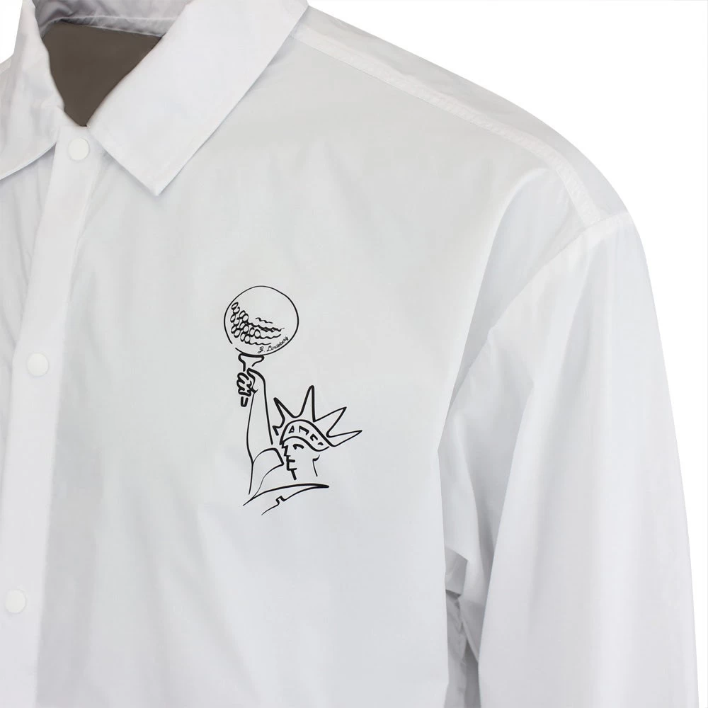 J.Lindeberg have introduced this limited edition button up jacket as part of their wider “tour collection” for 2023 – inspired by the US PGA Championship which will take place at Oak Hill C.C in Rochester, NY. It takes on a classic “coach jacket” silhouette and features the I Heart NY logo at the rear (with a golf ball in place of the heart icon) – a unique design which looks fresh in this monochrome colour combination. You’ll also find the Statue of Liberty printed at the left chest – this time holding a golf ball instead of her famous torch. A unique, statement J.Lindeberg jacket which will look at home both on and off the golf course.
