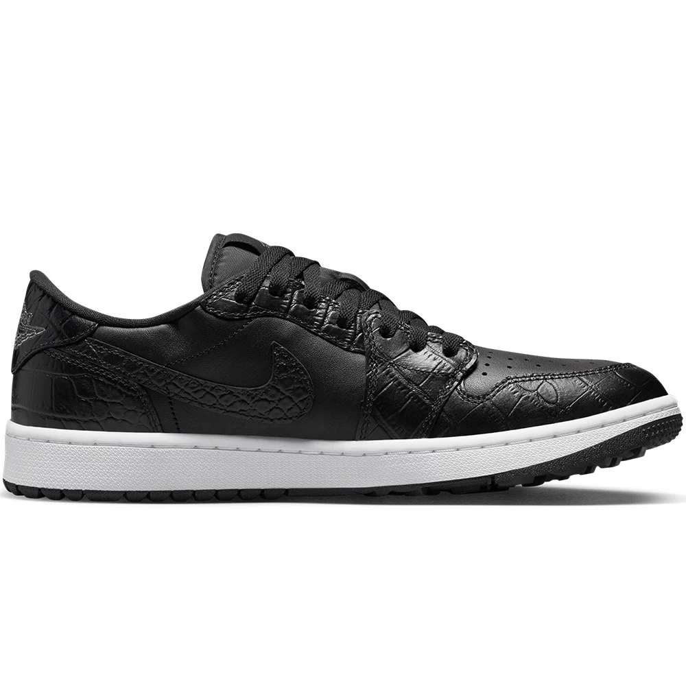 We can finally reveal the Nike Air Jordan 1 golf shoes – a brand new style which is based on one of the true icons of the sneaker world. This golf specific transformation features a “stitch for stitch” reconstruction of the AJ1 upper – meaning that the look, fit & feel remains very much true to the original. That means it also retains some of the legendary design details which make it so identifiable, such as the genuine leather upper, colour blocked aesthetic & Nike Air Jordan branding. Golf specific updates come in the form of a one year waterproof warranty & encapsulated Air at the heels – but the outsole is where you really notice the “G” treatment. For the first time ever, Nike Golf have utilised a spikeless outsole with an integrated traction pattern – perfectly balanced for wearing both on and off the golf course. That’s just one of the many factors which makes the Nike Air Jordan 1 golf shoes the must have shoe style of the year – newly updated with textured “croc” overlays for added style appeal.
