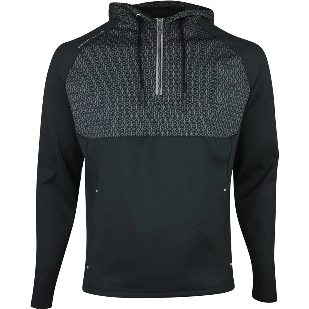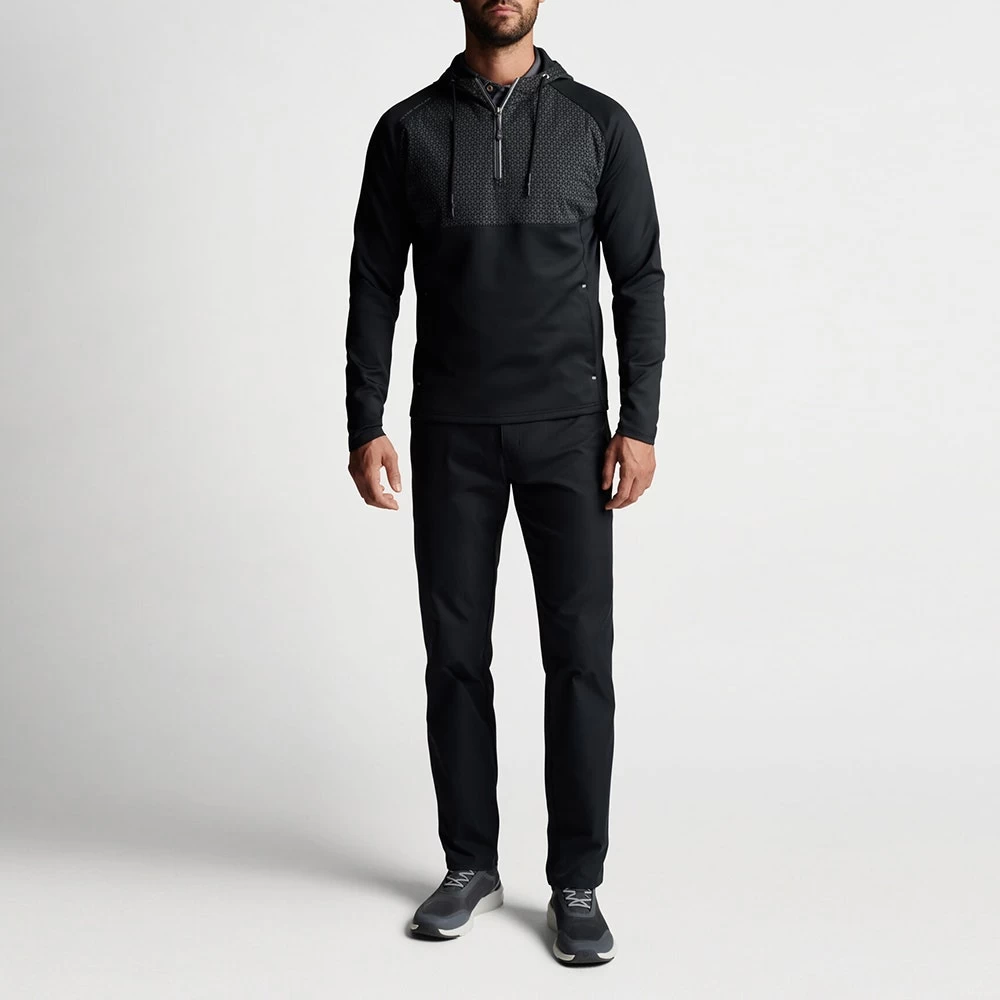 Peter Millar is one of the newest brands to arrive online at Golfposer and we love their outerwear range for Spring/Summer ’23. This particular hooded outer layer style makes great use of two different fabrics to provide the utmost functionality and comfort – all while embracing two of the most popular outerwear style trends; lightweight quilting & performance golf hoodies. The lightly padded chest panel is filled front panel offers incredible warmth levels without the bulk, while the stretch jersey fabric at the sleeves & rear features a high degree of stretch for maximum freedom of movement. One of our favourite styles to arrive from Peter Millar this season – especially in this colour option with the reflective geo print at the upper chest panel.