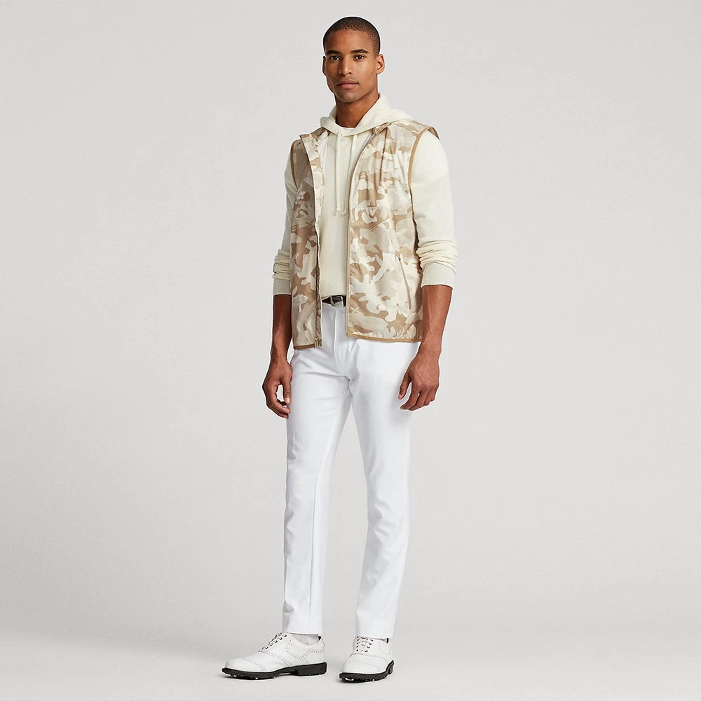 We love the look of this brand new wind vest which comes from the new RLX performance line by Ralph Lauren. It makes great use of a 2.5 layer shell with a high degree of stretch for maximum freedom of movement, while the full zip gilet silhouette is both sporty and functional for ease of on and off. RLX branding is featured at the shoulder, while the all over “Player Camo” print elevates the fashionable look once more. The soft shell finish on the fabric will repel a light rain shower, while the two front pockets are in a handy place for storage. An ideal lightweight option for laying your outfit in the cooler mornings and evenings, effortlessly stowing away in your golf bag when you don’t require the added protection.